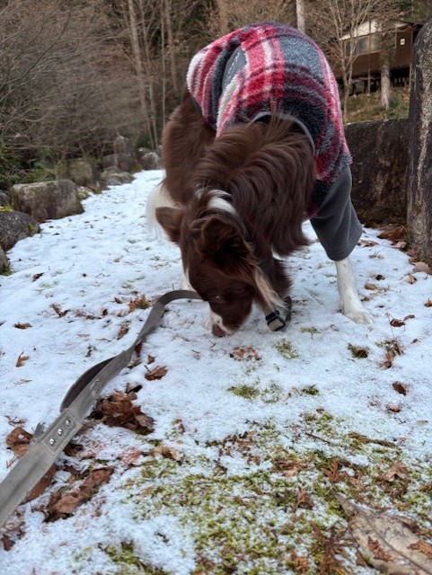 朝の散歩は雪!ステラがパクっと食べる(笑)