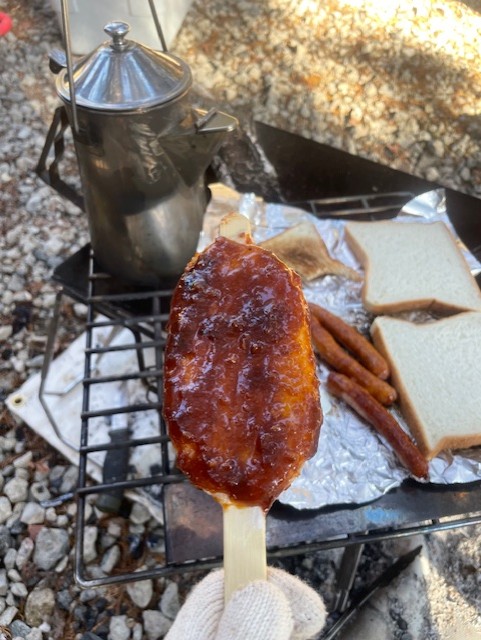 朝ごはんは、道の駅で買っておいた五平餅を焼きました。